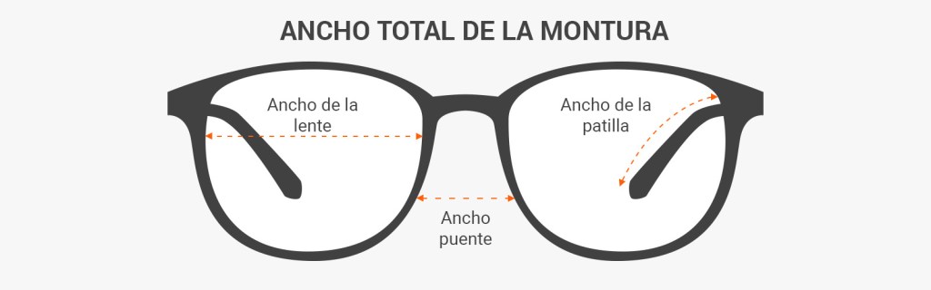 Ancho frontal: el ancho frontal es dos veces el ancho de la lente más el ancho del puente. Por ejemplo, ancho de lente = 47, ancho de puente = 16, ancho total = 110 ((47 × 2) +16).